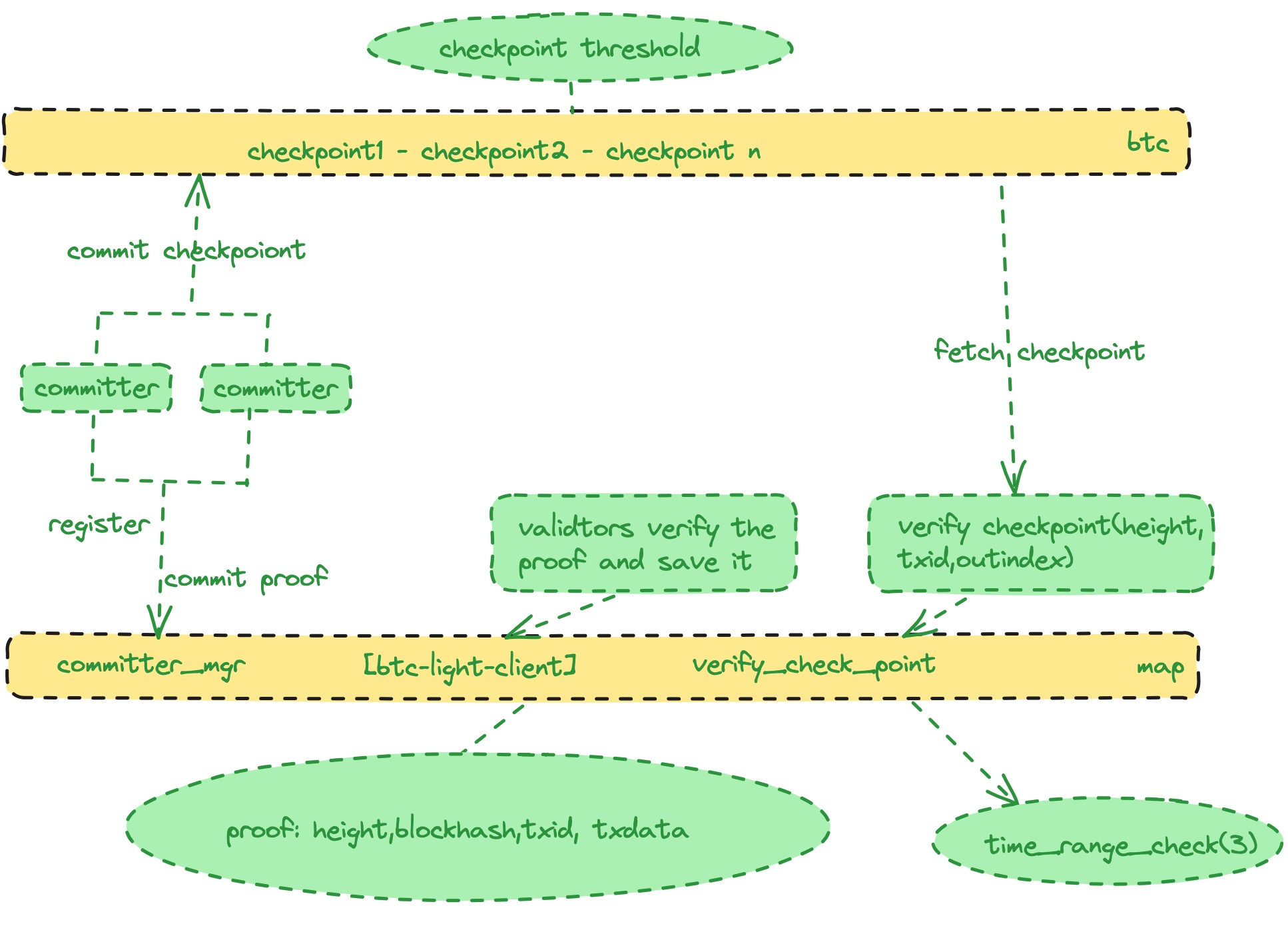 checkpoint and submits it to the Bitcoin network to ensure the determinism of the entire relay chain, preventing it from being forged or overturned. The checkpoint needs to include::- PreCheckPointHash: The hash of the previous checkpoint.
