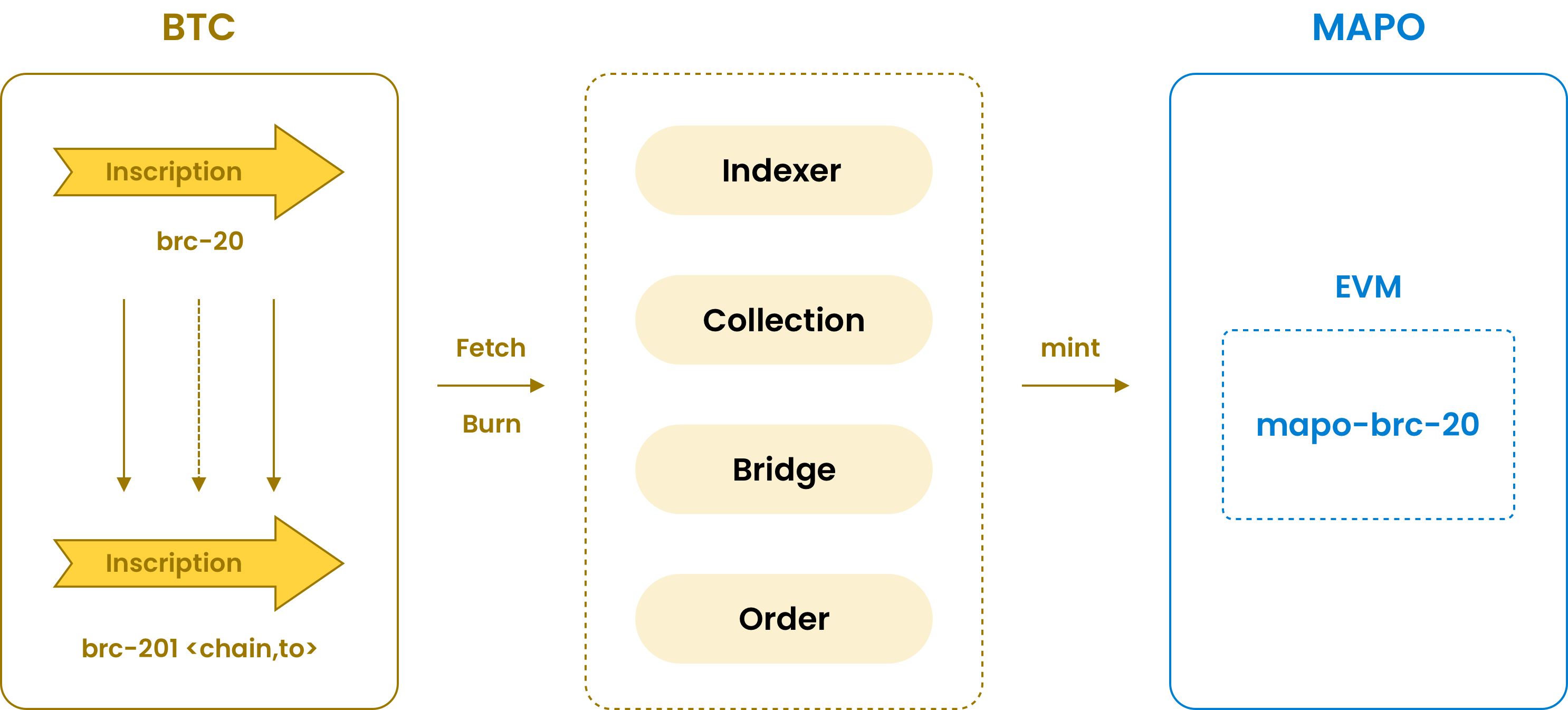 MAPO platform supports the cross-chain transfer of inscription assets (BRC-20) from the Bitcoin network to the MAPO platform in a peer-to-peer manner. This enables other cryptocurrencies on different blockchains to be traded with BRC-20 assets through a more convenient and cost-effective route, enhancing the liquidity of inscription assets. This interoperability helps expand the use cases of Bitcoin and integrates the Bitcoin ecosystem into a broader crypto financial ecosystem, bringing new contributions to the Bitcoin community.MAPO provides a comprehensive solution that allows users to easily transfer BRC-20 assets to the MAPO platform. MAPO utilizes the native mapo-brc201 protocol on the Bitcoin network, enabling users to seamlessly move assets from the BRC-20 protocol to the BRC201 protocol and cross-chain to the MAPO platform without any loss. As shown in the diagram: